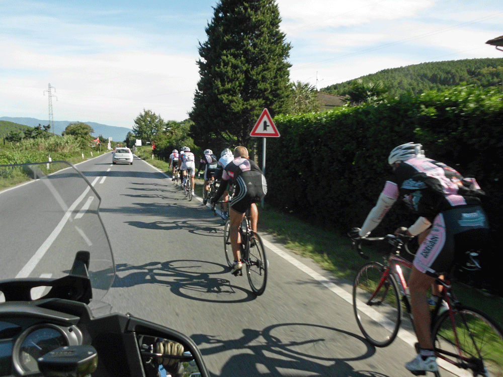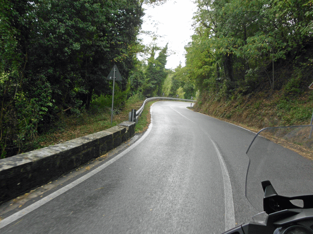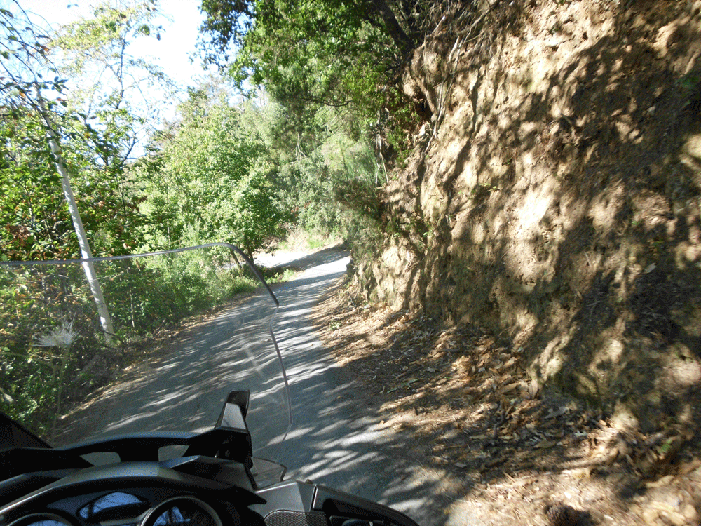 With a maze of local roads heading in all directions we are following the GPS. Soon we find ourselves on this little gem of a road. It is wide enough for one motorcycle, not two. The paving is good but the road is covered with leaves and debris and some water. It is also very steep, perhaps over 20 percent in some places. Sara has her doubts about it and I do too but we decide to give it a go for a little while. Suddenly after a number of switchbacks and steep descents it drops us onto a larger road with a sign pointing to Pignone, our next waypoint. The GPS was right after all. For us this road will forever be known as the Pigtown Cutoff!