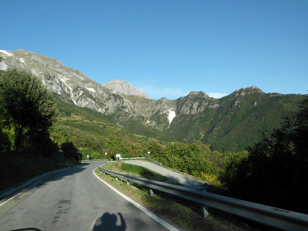 After New Castle we started climbing again, this time to the west over the Apuane Alps.. These peaks reach only about 7000 feet yet they are very rugged, and with much snow lingering from last winter! The road we are on appears to be a favorite with local motorcyclists and there are lots of bikes out. We see mostly Japanese bikes and Ducatis but there are a few Harleys as well. I don’t see the attraction myself but the Italian Hog riders would fit right in at home. We make our way over and through the mountains and are soon headed down the other side towards the coast. I guess I kind of knew they were here but I was surprised to see all of the marble quarries. This is the home of Carrara marble and the mountains are almost entirely made of it. We finish our day by jumping on the Autostrada for the ride back to Pisa.