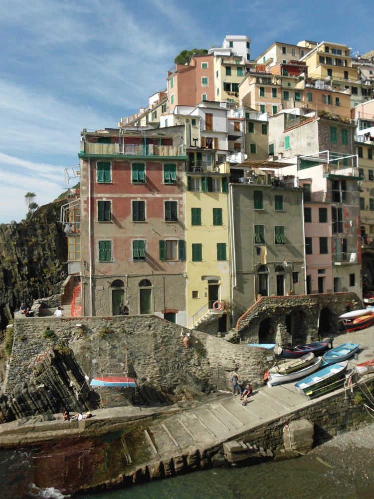 Today we are headed up the coast to the Cinque Terre and the village of Riomaggiore. This area is a Unesco World Heritage site, notable for the old villages and vineyards perched on the steep hillsides. You can reach Riomaggiore by road but cannot enter the village with a vehicle, even a motorbike. It’s just as well, the streets are so steep that few vehicles even attempt. Luckily there is parking for bikes and we can walk down to our hotel.