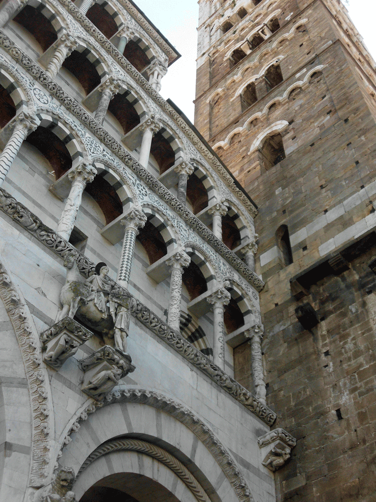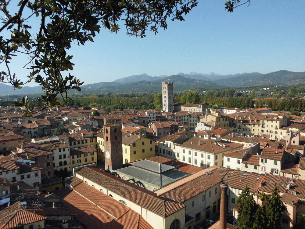 Lucca is our destination on our first day without the bike. We have been by here several times on our way to other places and were tempted to stop but we knew that we should spend more time here so we waited. It is a 15 minute train ride from Pisa Centrale to the Lucca station which is just outside the old city walls. We arrive just in time for lunch and enjoy our meal with a lovely view of the Cattedrale di San Martino.