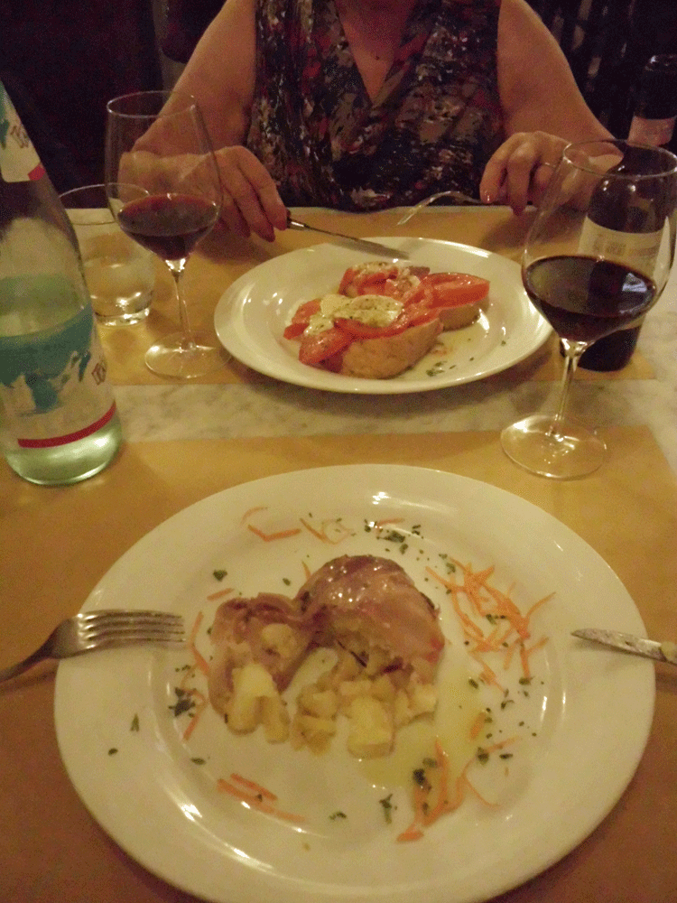 After the train ride and the museum we had worked up an appetite. It was a little early but the restaurants were open and we found a place on the Piazza next to the Duomo. I destroyed my “Tower of Potatoes wrapped in Tuscan Ham” before I thought to take a photo. It was excellent, just as was Sara’s bruschetta.