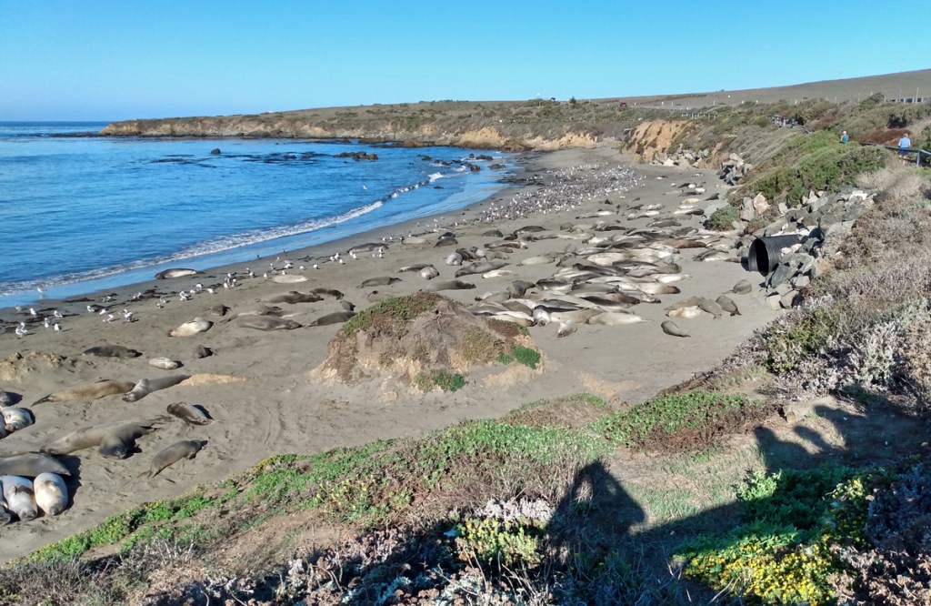 The Elephant Seal viewpoint is a must stop along the way, just north of San Simeon. They are always here but it it early enough in the day still that there are not many tourists here yet. The seal watchers can outnumber the seals by 2 to 1 on some days.